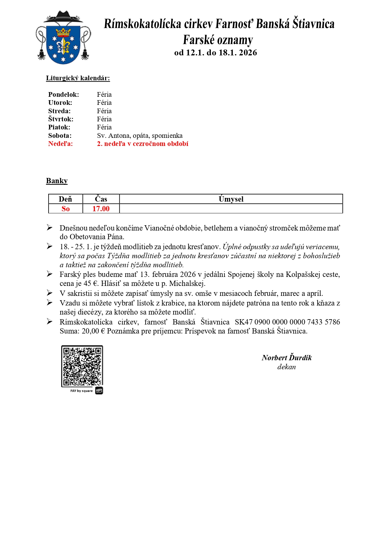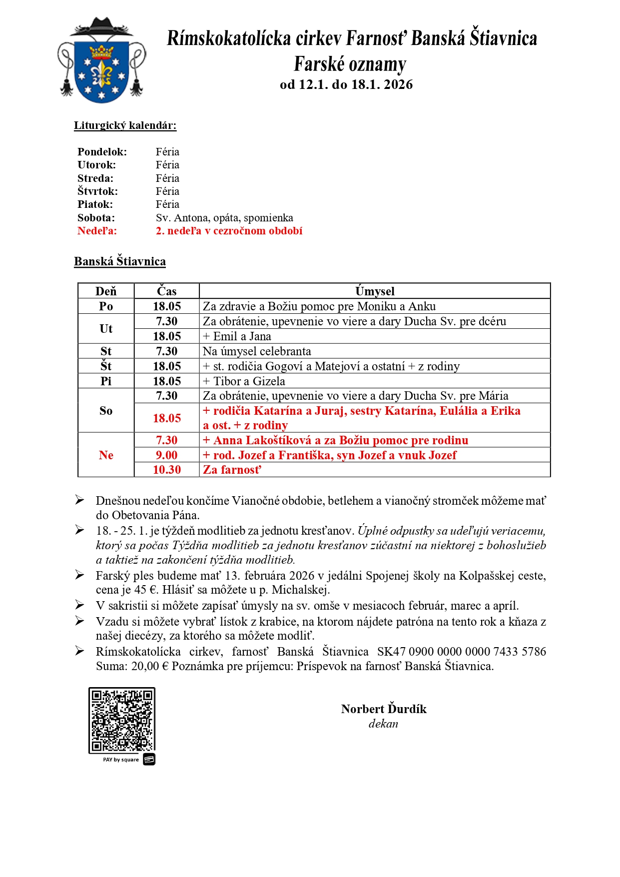 Farské oznamy a rozpis časov svätých omší od 12.1. do 18.1.2026
