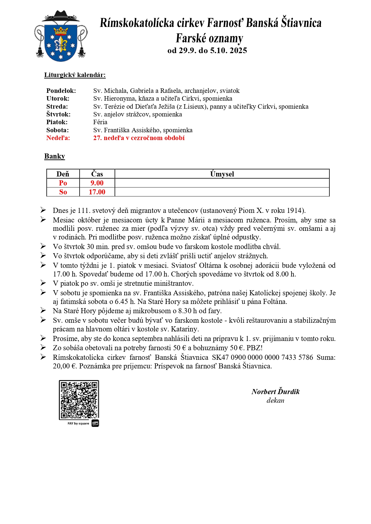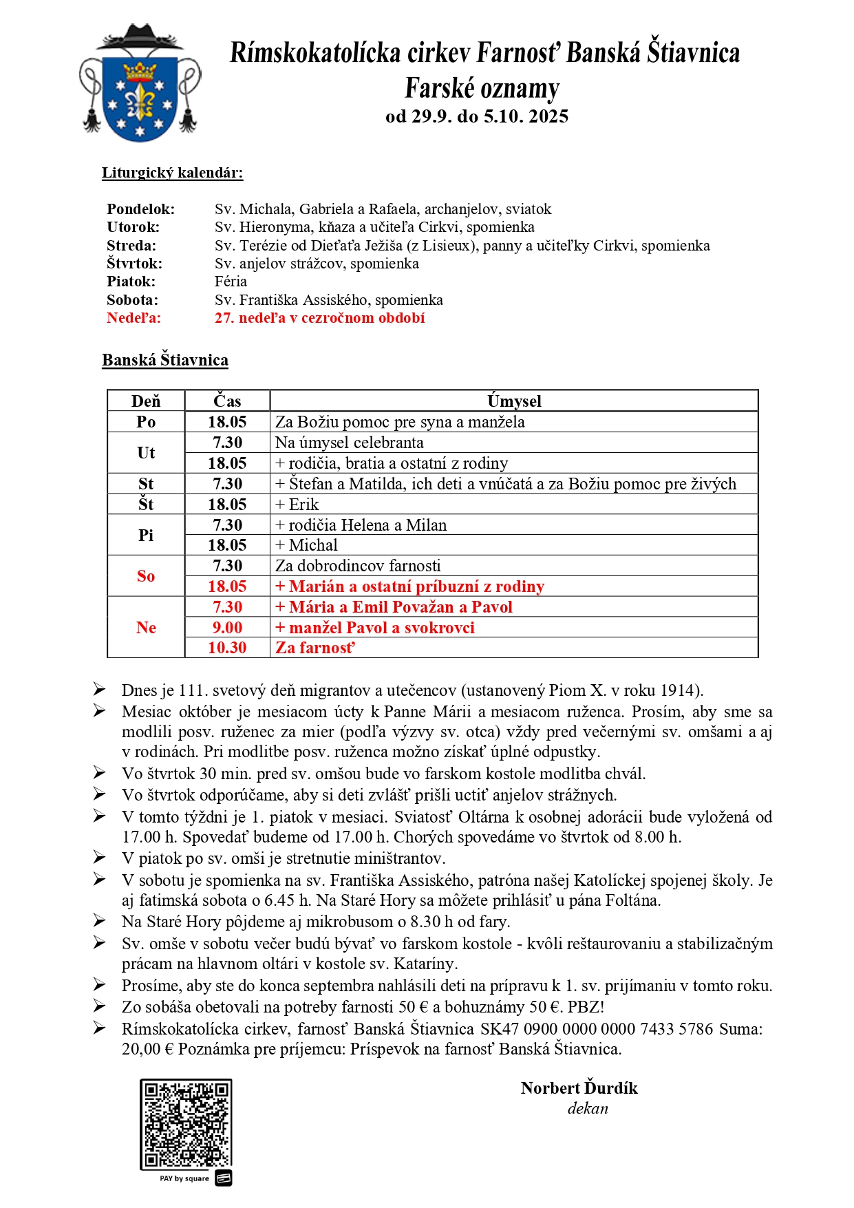 Farské oznamy a rozpis časov svätých omší od 29.9. do 5.10.2025