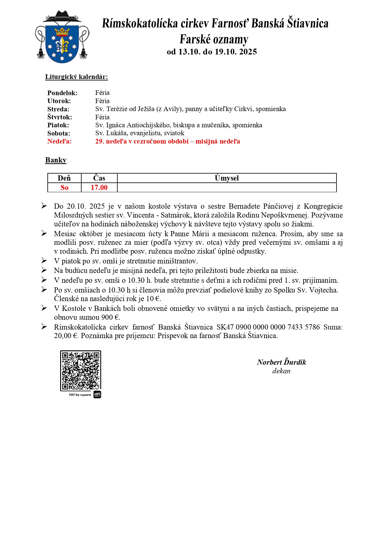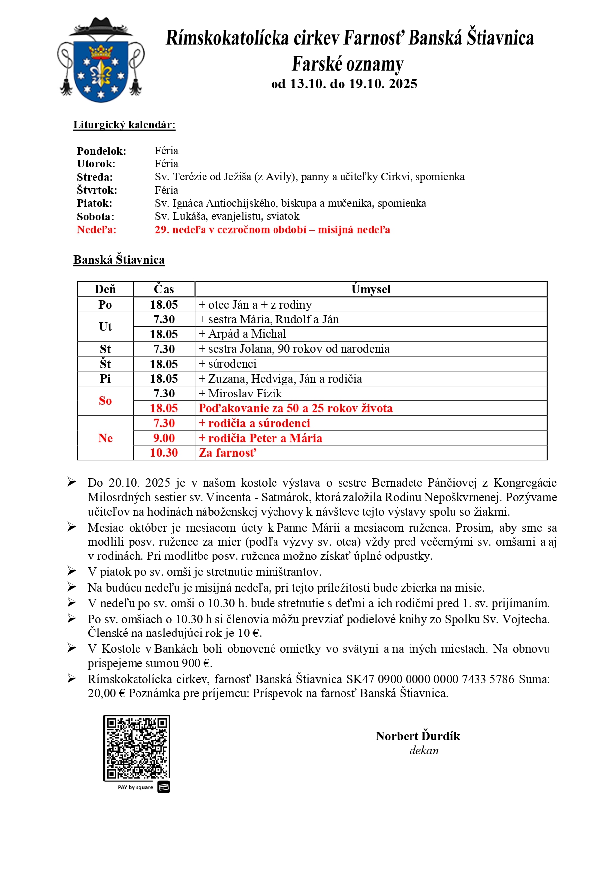 Farské oznamy a rozpis časov svätých omší od 13.10. do 19.10.2025