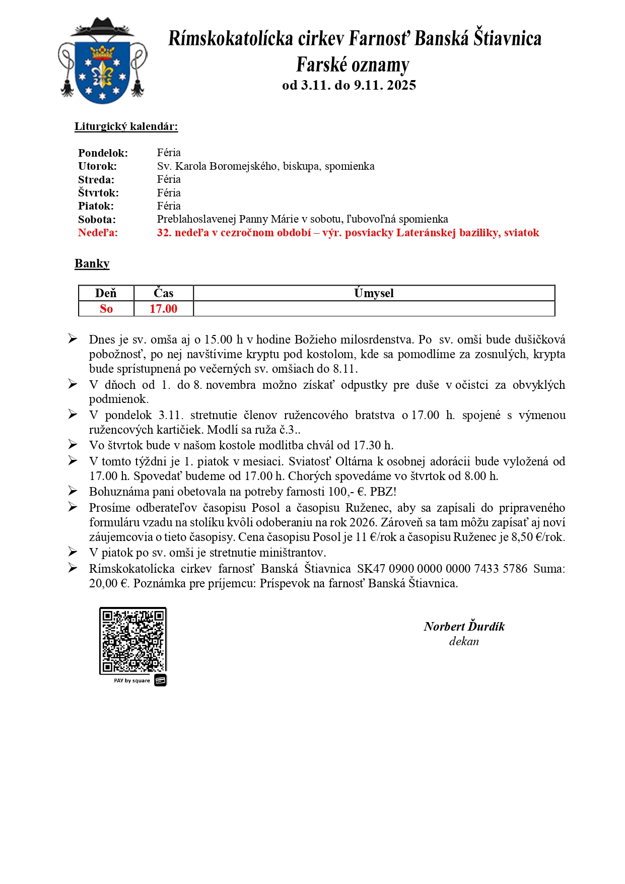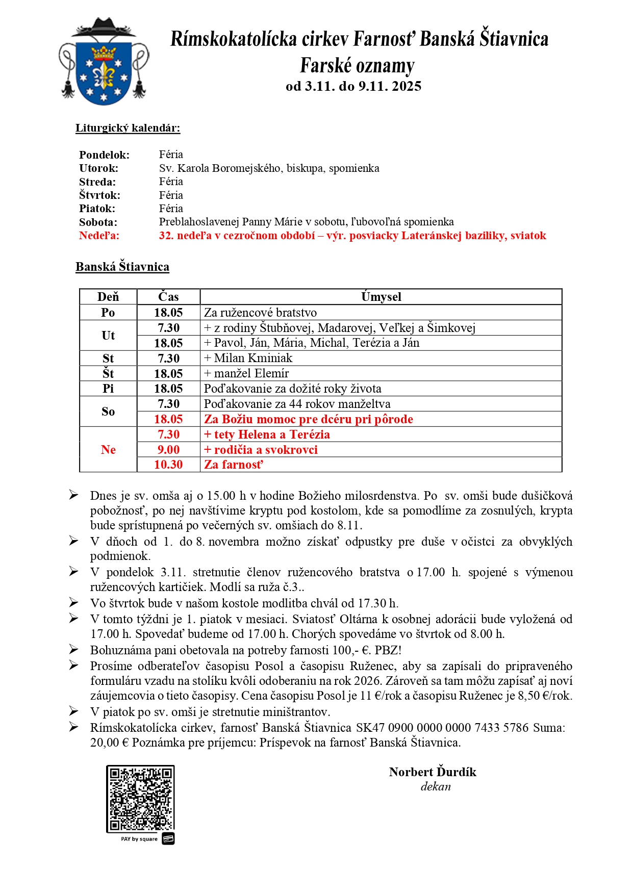 Farské oznamy a rozpis časov svätých omší od 3.11. do 9.11.2025