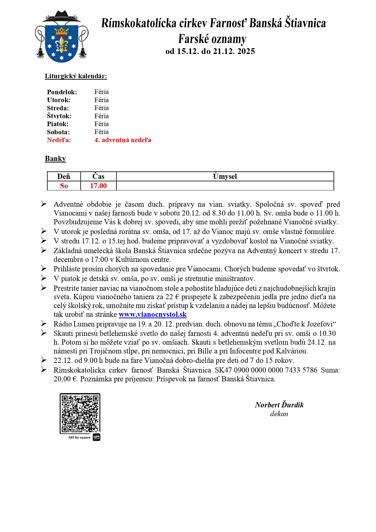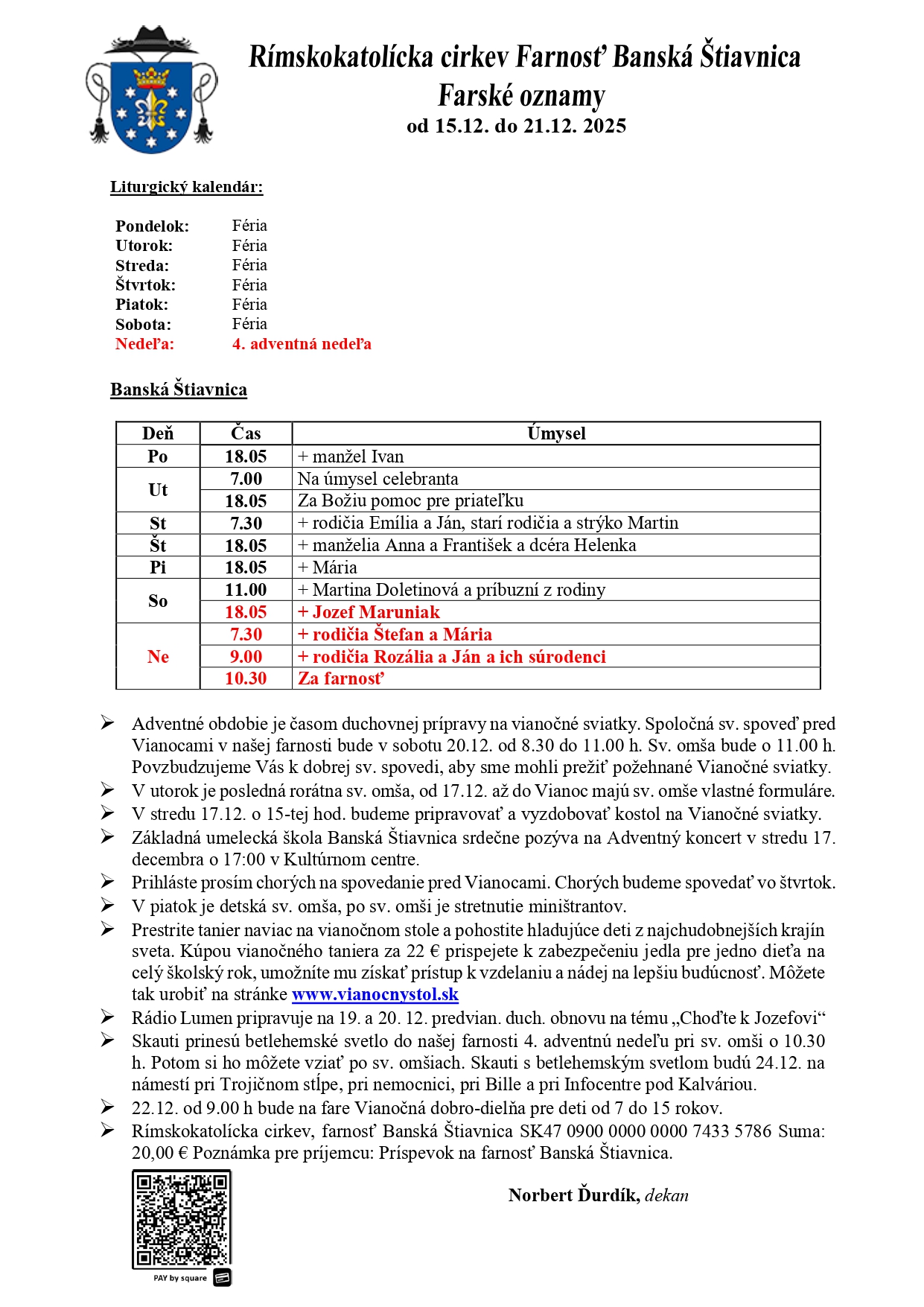 Farské oznamy a rozpis časov svätých omší od 15.12. do 21.12.2025