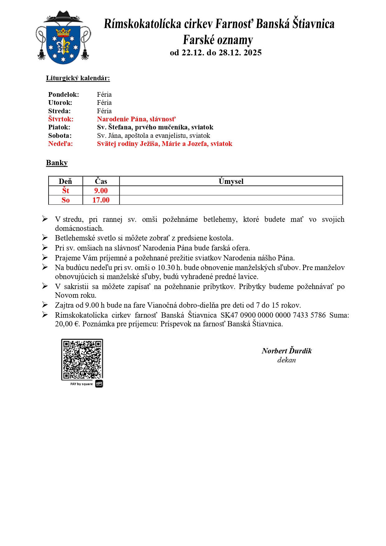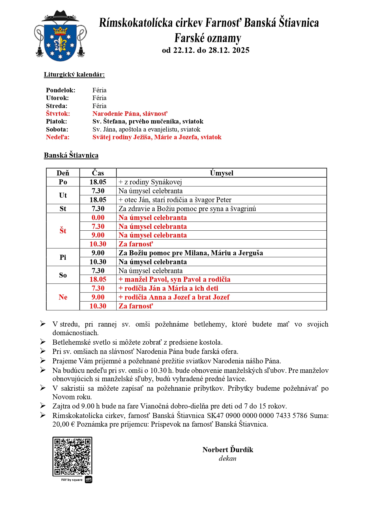 Farské oznamy a rozpis časov svätých omší od 22.12. do 28.12.2025