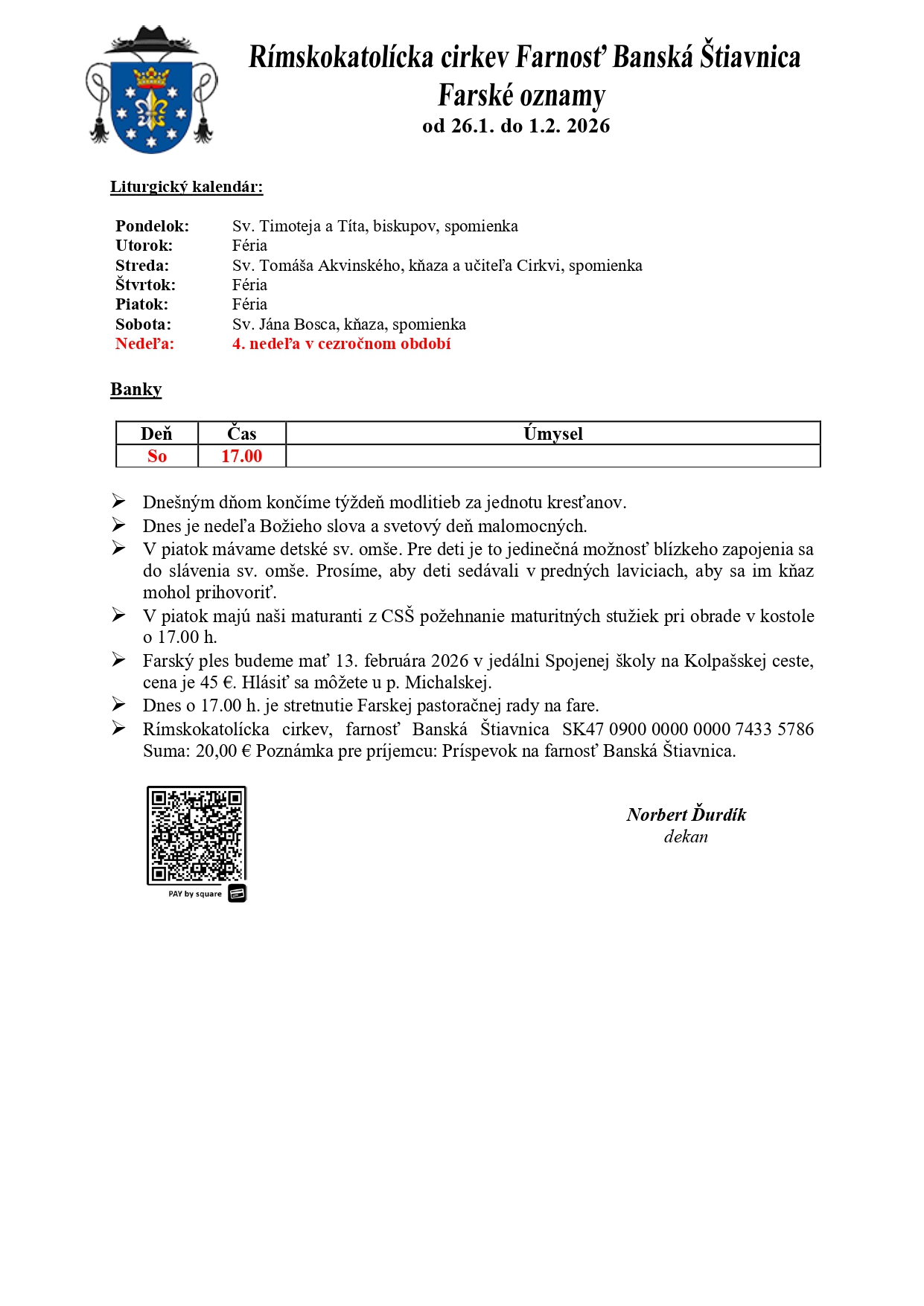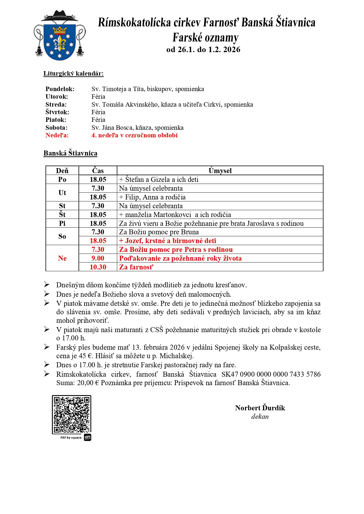 Farské oznamy a rozpis časov svätých omší od 26.1. do 1.2.2026