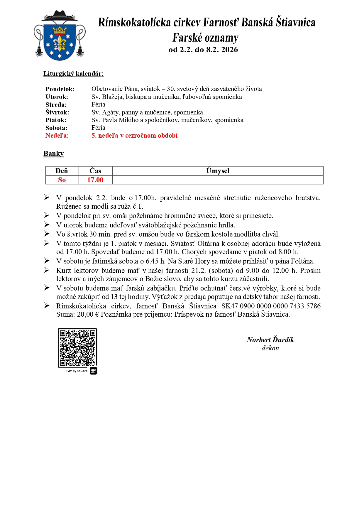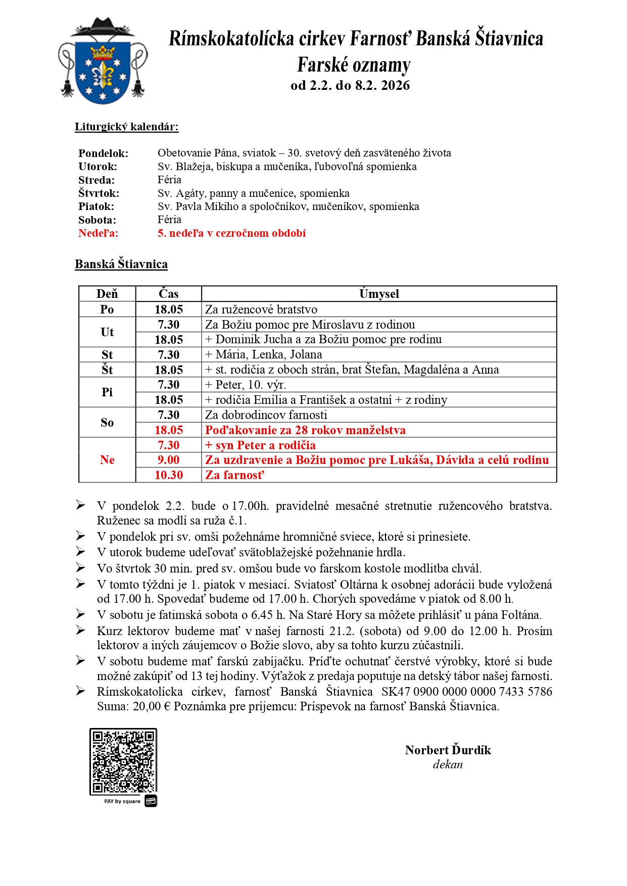 Farské oznamy a rozpis časov svätých omší od 2.2. do 8.2.2026